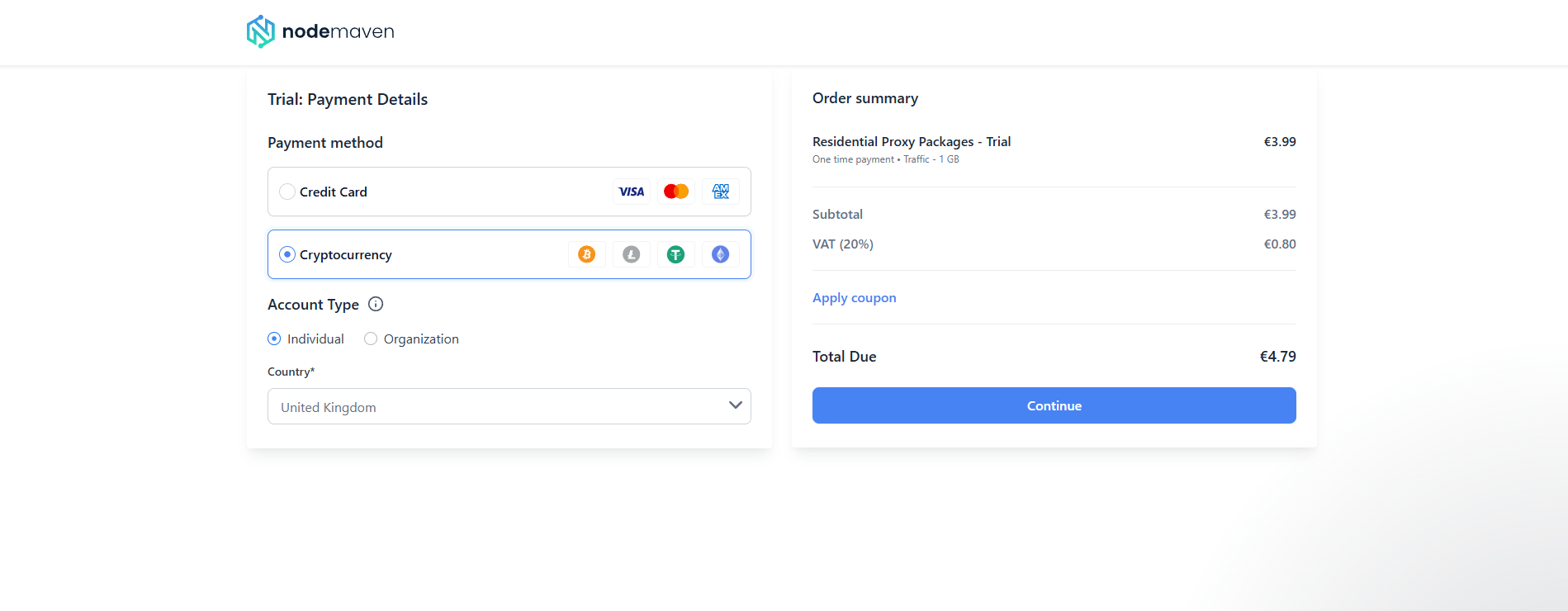 NodeMaven поддерживает несколько способов оплаты и моделей расчёта, что делает сотрудничество удобным для разных категорий пользователей. Можно выбрать стандартную подписку с фиксированным месячным тарифом или оплату по модели Pay-as-you-go – когда вы оплачиваете только фактически использованный трафик. Это особенно удобно для тех, кто работает с непостоянным объемом нагрузки или тестирует различные проекты.