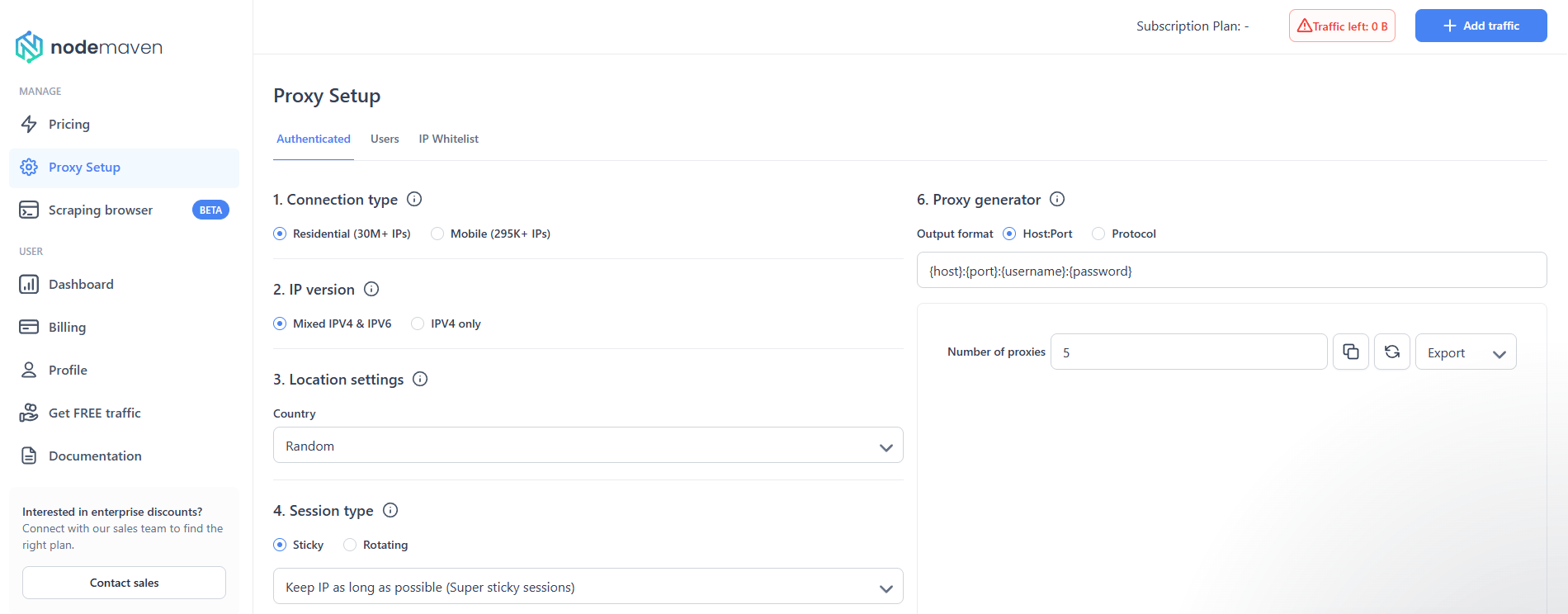После активации аккаунта пользователь получает доступ к дашборду, где можно выбрать нужные параметры подключения. NodeMaven предлагает поддержку протоколов HTTP, HTTPS и SOCKS5, что позволяет гибко интегрировать прокси в различные программы и скрипты.