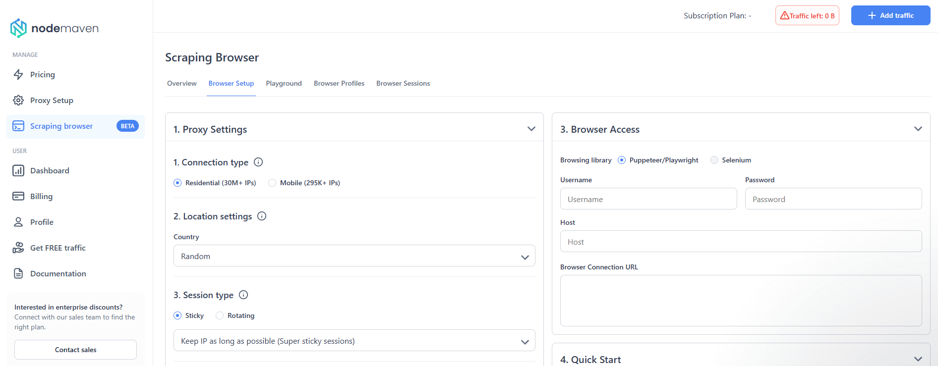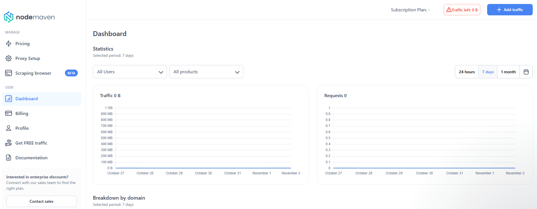 Чтобы начать работу, достаточно пройти стандартную регистрацию на сайте nodemaven.com После ввода адреса электронной почты и создания пароля необходимо подтвердить e-mail, после чего пользователь получает доступ в личный кабинет. Интерфейс панели управления продуман интуитивно: все основные функции – покупка GB, выбор типа прокси, настройка гео-локаций и управление сессиями – находятся в одном месте.