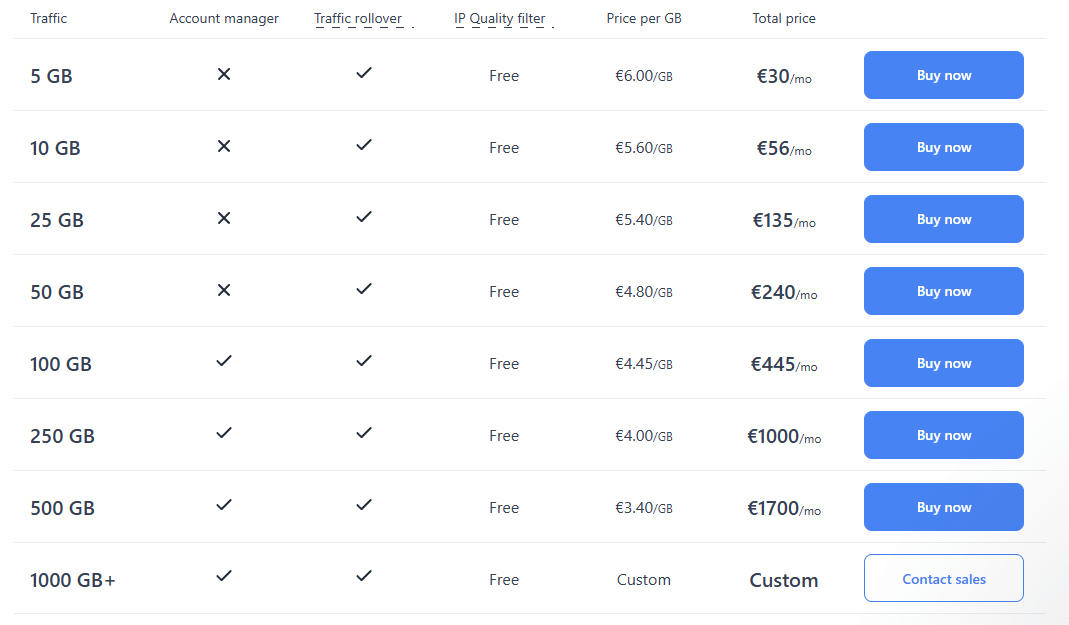 При больших объёмах трафика цена за ГБ может опускаться ниже: есть опция «Less than €1/GB» для крупных пакетов.