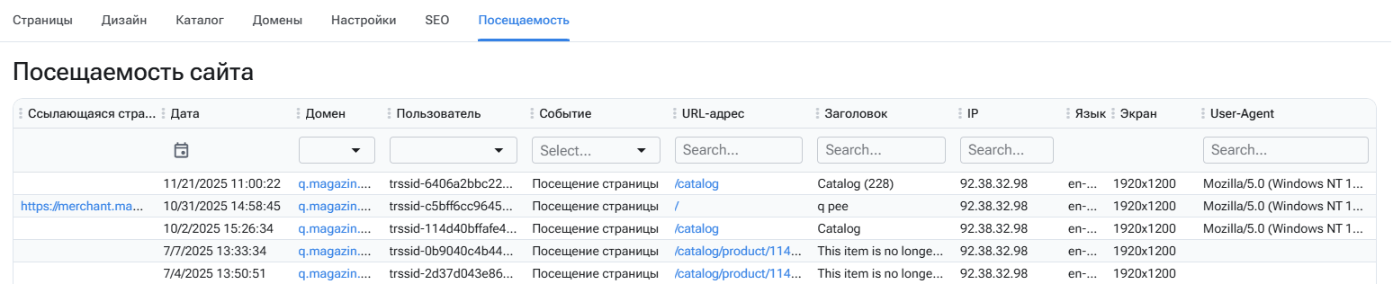Во вкладке «Посещаемость» отображается детальная информация по трафику и событиям в магазине:
