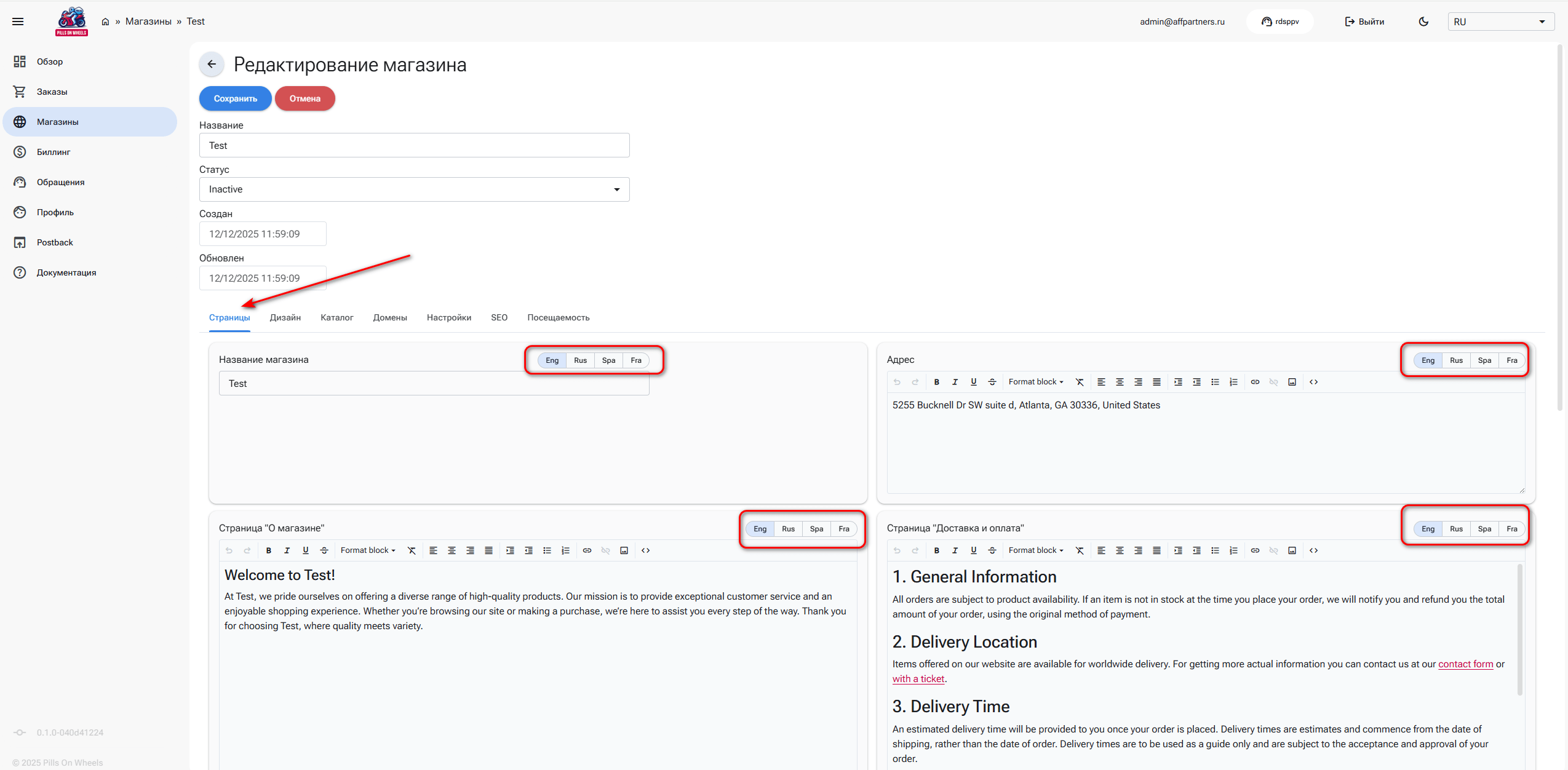 Во вкладке «Страницы» веб-мастер управляет всем текстовым наполнением витрины: