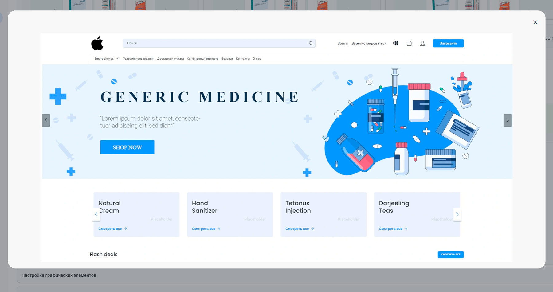 Вкладка «Дизайн» отвечает за внешний вид магазина. Здесь реализована максимально простая и понятная логика: