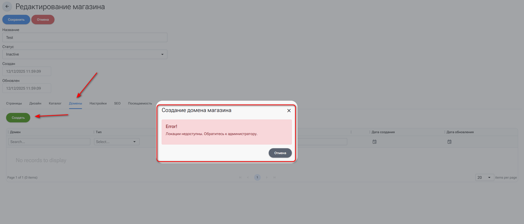 Добавление доменов осуществляется после обращения в службу поддержки. Такой подход позволяет команде платформы оперативно выпускать домены, корректно настраивать инфраструктуру и обеспечивать стабильную работу магазинов без технических рисков для веб-мастера.