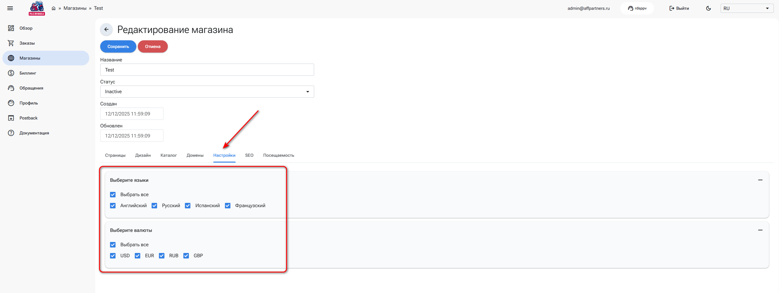 Во вкладке «Настройки» личного кабинета Pills on Wheels веб-мастер может гибко адаптировать магазин под разные страны и аудитории. Вся локализация настраивается в одном интерфейсе, без необходимости создавать отдельные витрины или вносить технические правки: