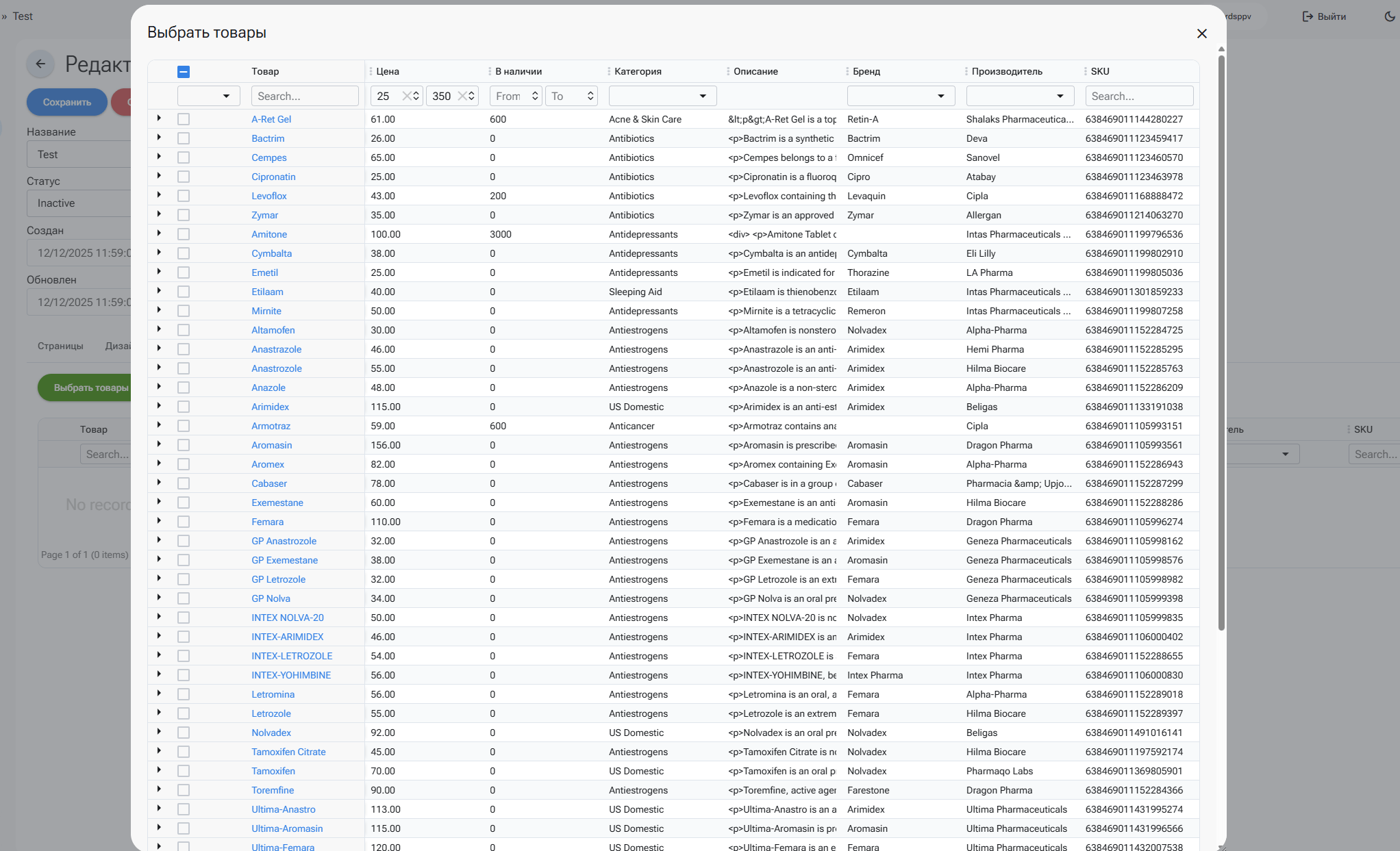 Во вкладке «Каталог» в Pills on Wheels реализован полноценный инструмент управления ассортиментом магазина, который позволяет веб-мастеру гибко адаптировать витрину под конкретный источник трафика, гео или связку.