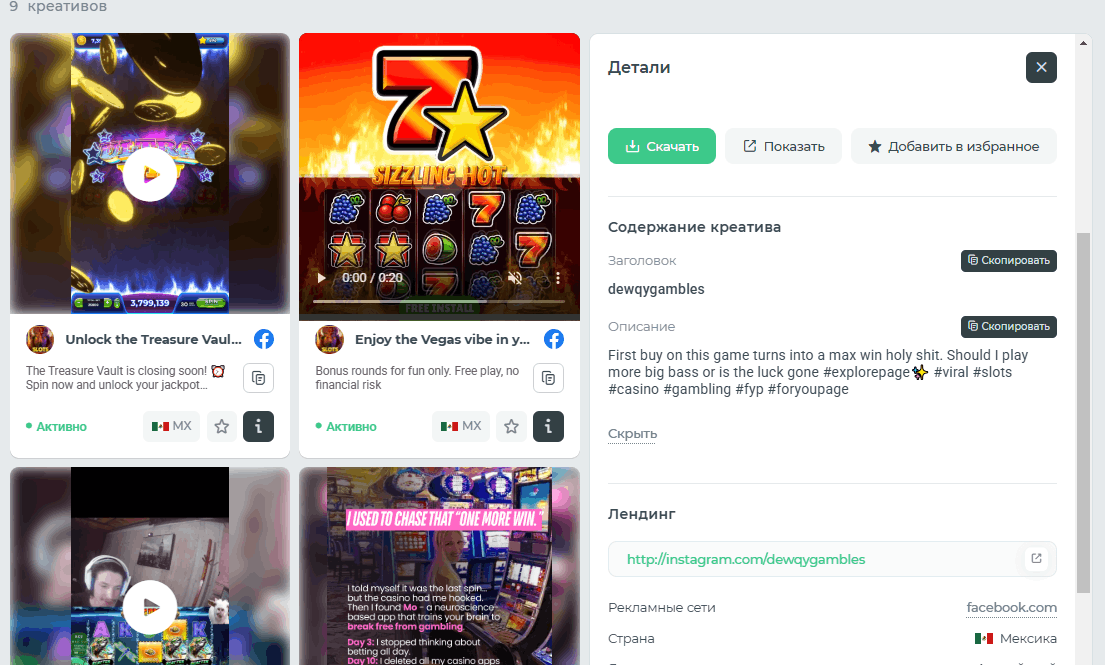 Сервис показывает активные объявления конкурентов: изображения, видео, тексты и посадочные страницы. Изучив несколько креативов, можно заметить повторяющиеся элементы – триггеры в заголовках, формат оффера, стиль визуалов. Это дает понимание, какие идеи уже доказали свою эффективность.
