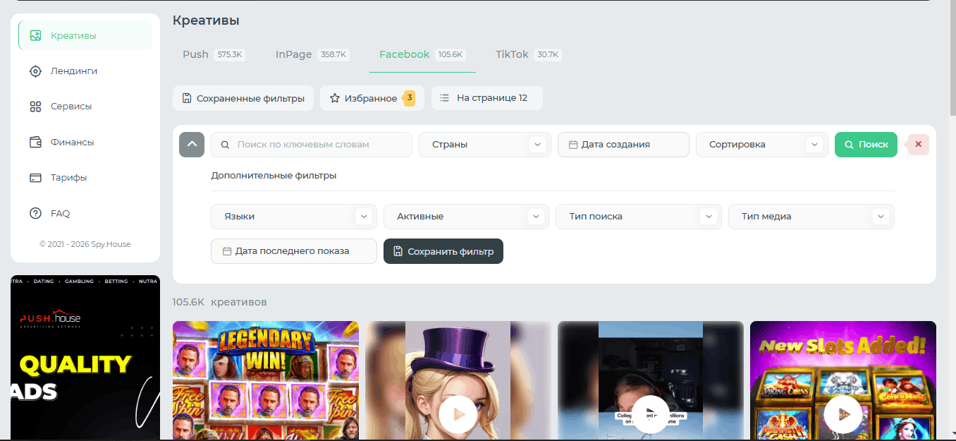 Spy.House – это ведущий spy-сервис, предназначенный для анализа и мониторинга рекламных кампаний в Facebook, TikTok, Push и InPage форматах. Платформа собирает объявления из разных источников, систематизирует их и позволяет пользователю искать рекламу по множеству параметров: креативы, лендинги, источники трафика, офферы и гео