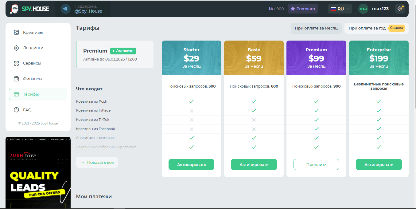 По соотношению с тем, сколько можно сэкономить на тестах и дизайнерах, услуги сервиса радуют как никогда. Уже за 99$ вы можете просматривать креативы Facebook* и TikTok, что очень ценится, ведь ресурсы и расходники на таких площадках очень затратны. По уровню ниже находятся базовая и стартовая подписка, которые позволяют просматривать актуальные креативы для Push и InPage форматах. Подойдет для начинающих так как для таких форматов не требуется большой бюджет.